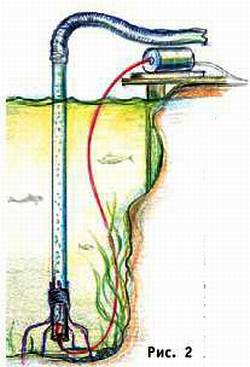 И опять начните с эксперимента. Возьмите трубу (лучше всего пластиковую) диаметром 40–60 мм и длиною 2–3 м. На конце ее при помощи скотча закрепите шланг и проволочные упоры для установки трубы на дне пруда (рис. 2).