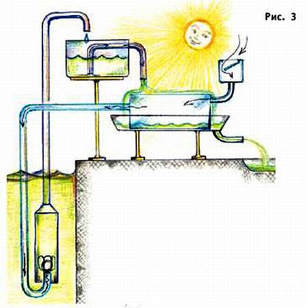 Зачерненный металлический бак соединен трубкой со входом эрлифта. Под действием солнца воздух в баке нагревается, расширяется и пузырьки его, попадая в эрлифт, заставляют его работать. Казалось бы, все очень просто. Однако, как только весь воздух выйдет из бака, работа устройства сама собою прекратится. Чтобы ее возобновить, нужно наполнить бак свежим воздухом. Это делается при помощи дополнительных приспособлений. Когда эрлифт начинает свою работу, доставляемая им вода вначале собирается в специальной емкости с установленным в ней сифоном. Комбинация емкости и сифона — обычной изогнутой трубки — хоть и очень простое устройство, но прекрасно справляется.