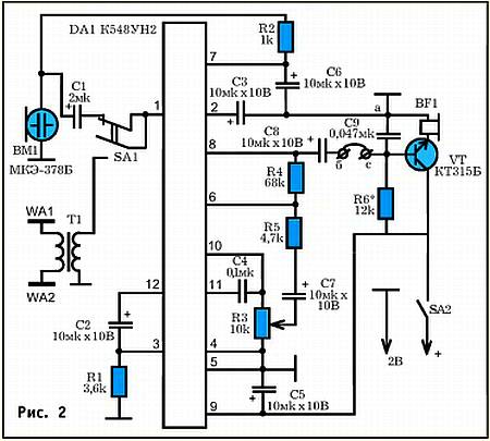 Аппаратура для прослушивания голосов водных обитателей снабжена чувствительным усилителем (рис. 2), собранным на интегральной микросхеме DA1, и рядом навесных элементов, которые обеспечивают ее нормальную работу.