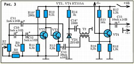 На транзисторах VT2, VT3 построен вспомогательный инфразвуковой генератор приставки, частота которого может регулироваться в пределах 3…15 Гц переменным резистором R7. Уровень выходного сигнала можно изменять переменным резистором R13. На стабилитроне VD1 собран звуковой генератор «белого шума». Его колебания через вторичную обмотку трансформатора Е2 попадают вместе с искусственными инфразвуковыми колебаниями в эмиттерную цепь транзистора VT4, работающего преобразователем частоты. К базе VT4 подаются с точки «б» (рис. 2) воспринятые микрофоном ВМ1 и усиленные внешние инфразвуковые колебания. Возникающие биения коллекторного тока VT4 выделяются на нагрузке каскада R17 и через конденсатор С15 попадают на выходной усилительный каскад с транзистором VT1 (при этом перемычка между точками «б» и «с» должна быть отключена).