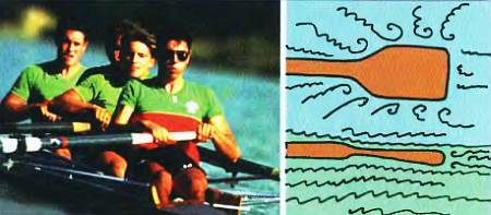 Приглядитесь к тому, как гребут и как держат весла спортсмены. После мощного гребка весла выходят из воды и возвращаются обратно по воздуху — и лопасти весел повернуты в горизонтальное положение! Даже здесь, на воздухе, в ходе соревнований экономят на всем, хотя сопротивление движению весла в воздухе почти в тысячу раз меньше, чем в воде! И форма лопасти спортивного весла выполнена таким образом, чтобы создавать минимальное сопротивление при движении в воде — а это не только большая площадь лобового сечения, но еще и минимальные завихрения позади весла, которые тоже создают потери.