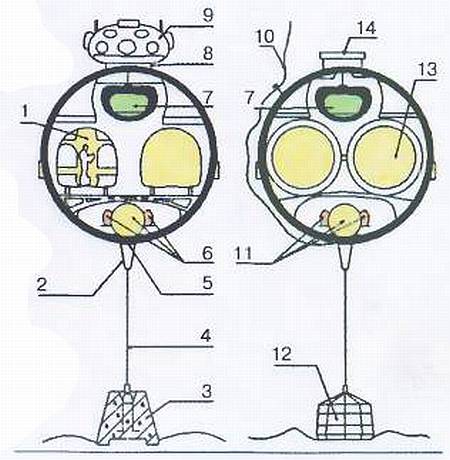 1— буксирный батискаф; 2— якорь постоянный; 3— стяжной трос; 4— торцевая заглушка; 5— компенсатор; 6— батискаф; 7— стабилизатор; 8— передвижная якорная лебедка; 9— сбросные якоря.