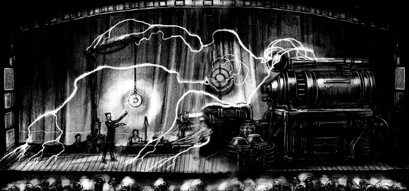 Тесла подал знак Клоппу, и тот начал что-то проделывать с одной из черных коробок. Секунда-другая, и все устройства на сцене ожили, помигивая и тихо гудя. Мистер Тесла занял место среди них; волосы у него тотчас встали дыбом, как у рассерженной кошки. У Дэрин в волосах тоже стало немного покалывать, а в воздухе будто запахло летней грозой.
