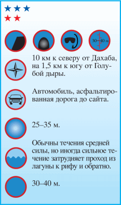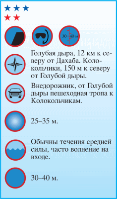 Для рекреационных дайверов сама лагуна интереса не представляет – немногочисленные кораллы местами сильно повреждены, рыбы мало. Зато великолепный дрифт-дайв от Колокольчиков до Голубой дыры– один из самых запоминающихся подводных маршрутов Дахаба. Однако для того, чтобы им насладиться, сначала придется со всем снаряжением пройти по тропинке к месту погружения. Путь лежит мимо стены с памятными табличками, на которых нанесены имена дайверов, сгинувших в Голубой дыре. Прогулка по-настоящему настраивает на серьезный лад, причем не только новичков.