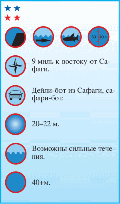 Планировать погружение можно, только предварительно проверив направление течения. В зависимости от полученного результата его можно организовать либо как дрифт-дайв, либо как дайв с возвращением к месту стоянки. Если есть возможность совершить два-три погружения, исследуйте риф со всех сторон. Если же возможности ограничены одним погружением, то стоит провести дрифт-дайв вдоль восточной стенки.