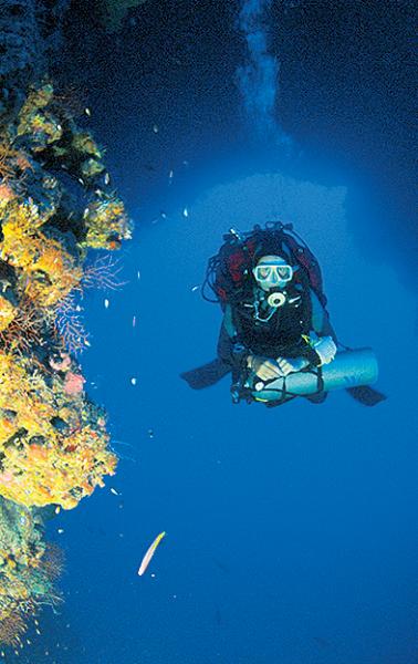 Другой вариант маршрута – войти в воду через расщелину Колокольчиков за кладбищем погибших дайверов, опуститься на глубину 65 м и следовать в направлении риф по правую руку. При этом сворачивать некуда, а арка окажется прямо перед глазами – искать не придется. Следует внимательно следить за расходом донной смеси. В обычных условиях (легкое попутное течение) маршрут до арки занимает около 15 мин. Если течение окажется встречным, правильнее начинать подъем до 60–55 м раньше, до достижения арки.