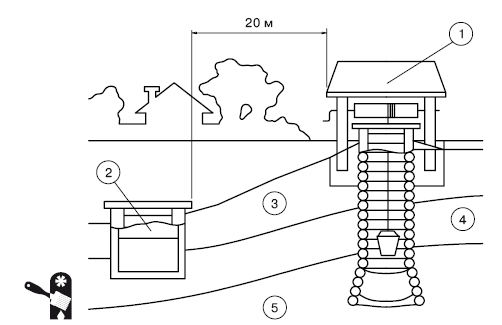 Рис. 1.6.Расположение колодца: 1 – колодец; 2 – выгребная яма; 3 – поверхностный водоносный горизонт («верховодка»); 4 – водоупорный слой глины; 5 – защищенный водоносный горизонт