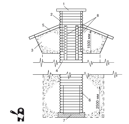 Рис. 1.7.Деревянный колодец с зумпфом: 1 – колодезная крышка; 2 – оголовок; 3 – насыпь под отмостку; 4 – венцы; 5 – отмостка; 6 – водоприемная часть; 7 – зумпф; 8 – вертикальные доски для фиксации венцов