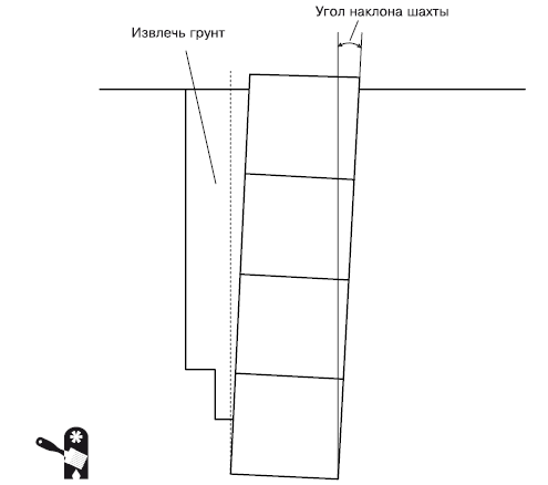 Для выравнивания шахты колодца нужно выбрать грунт с наружной стороны колонны. Причем грунт придется выбирать не просто на ширину, необходимую для придания колонне колодца вертикальности, но так, чтобы в шахте можно было работать (Рис. 1.19, 1.20). Копать придется много – исправление ошибок всегда ведет к большим трудозатратам. При этом необходима страховка человека, работающего в шахте, – колонна колодца может наклониться и придавить копателя, за этим нужно внимательно следить наверху, чтобы предотвратить несчастный случай.