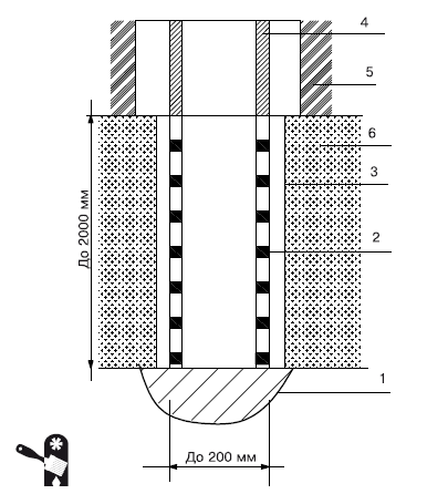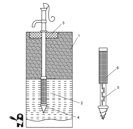 Рис. 1.28.Устройство абиссинского колодца с ручным насосом для подъема воды: 1 – грунт; 2 – водоносный слой грунта; 3 – бетонный цоколь; 4 – наконечник; 5 – труба с отверстиями для поступления воды; 6 – фильтрующая сетка