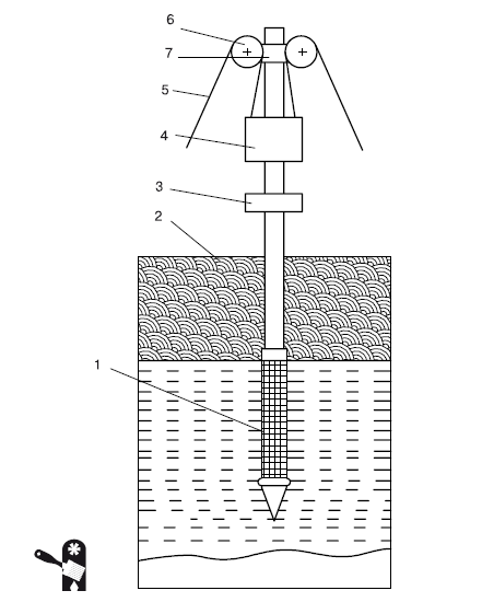Рис. 1.29.Забивка абиссинского колодца: 1 – сетчатый фильтр; 2 – труба; 3 – первый хомут (подбабок); 4 – баба; 5 – веревка; 6 – блок; 7 – второй хомут