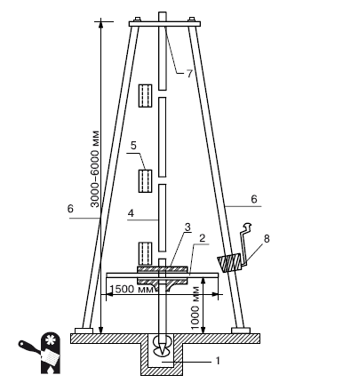 Рис. 1.30.Самодельная буровая установка [6] : 1 – бур; 2 – вороток; 3 – тройник; 4 – штанга; 5 – муфта; 6 – вышка-тренога; 7 – отверстие; 8 – лебедка