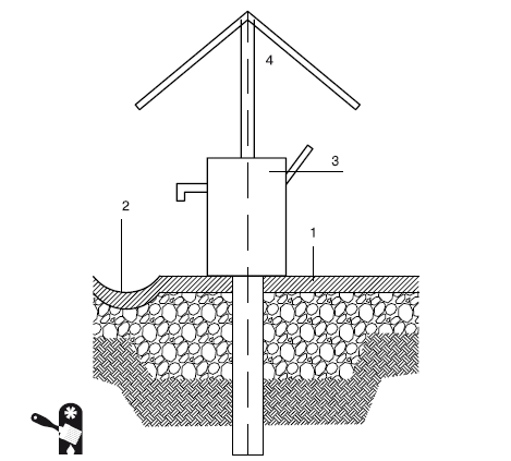 Рис. 1.32.Шатер и глиняный замок с отмосткой для скважины: 1 – отмостка; 2 – отводная канава; 3 – насос; 4 – шатер