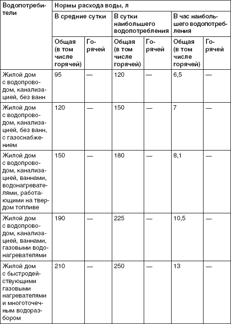 Прежде чем решаться на устройство той или иной системы водоснабжения, необходимо определить, сколько же воды понадобится для вашего загородного дома. При этом совершенно не требуется сложных расчетов, не нужно вспоминать, сколько воды расходуется при приготовлении пищи или принятии душа каждым членом вашей семьи. Все уже определено. Существует специальный норматив, определяющий нормы расхода воды потребителями, – СНиП 2.04.01–85* «Внутренний водопровод и канализация зданий. Системы внутреннего холодного и горячего водоснабжения». В нем указаны нормы расхода воды потребителями, и именно из него следует исходить, планируя водопотребление своего дома. Ориентируясь на данные нормы и правила, можно определить не только требуемое количество воды, но и инженерное оборудование, которое сможет обеспечить вас этой водой (табл. 1.1).