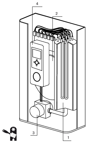 Рис. 3.13.Электрический котел: 1 – блок нагрева; 2 – расширительный бак; 3 – циркуляционный насос; 4 – блок управления