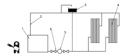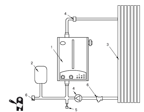 Рис. 3.15.Схема подключения отопительного котла с закрытым расширительным баком: 1 – электрический отопительный котел; 2 – закрытый расширительный бак; 3 – отопительные радиаторы; 4 – циркуляционный насос; 5 – вентиль; 6 – запорная арматура