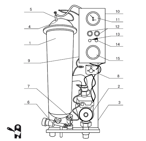 Рис. 3.16.Схема электрического котла с сервисным оборудованием: 1 – бак; 2 – циркуляционный насос; 3 – основание; 4 – крышка бака; 5 – ТЭНы; 6 – предохранительный клапан; 7 – кран удаления воздуха; 8 – аварийный термовыключатель; 9 – пускорегулирующий блок; 10 – панель управления; 11 – термоманометр; 12 – переключатель мощности; 13 – сигнальная лампочка «Сеть»; 14 – сигнальная лампочка «Перегрев»; 15 – терморегулятор капиллярный