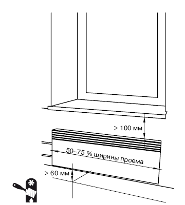 При расположении радиаторов под окном обязательно следует учитывать размеры оконного проема и, исходя из них, подбирать размер радиатора. Чтобы поток теплого воздуха создавал «тепловую завесу» и препятствовал проникновению холодного воздуха от окна в помещение, ширина радиатора должна быть не менее 50 % ширины оконного проема (рекомендуемая ширина радиатора – от 50 до 75 % ширины оконного проема). При этом высота радиатора должна быть такой, чтобы после установки зазор между ним и полом составлял не менее 6 см, а между верхним краем радиатора и подоконником – не менее 10 см (Рис. 3.26).