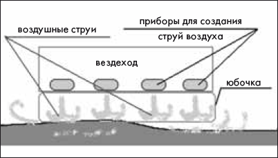 Струи воздуха или газа бьют вниз, создавая повышенное давление внутри резиновой юбочки. Попросту говоря, воздух давит изнутри во все стороны и толкает вездеход вверх, держит его на весу.