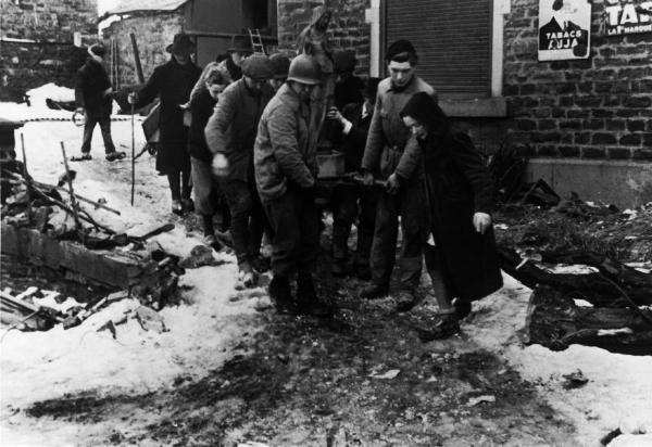 Ла-Глез, Бельгия, 1 февраля 1945 г.Хранитель памятников Уокер Хэнкок (на фото впереди слева, в армейской каске) помогает местным жителям перенести Мадонну Ла-Глеза в безопасное место. (Фото из личного архива Уокера Хэнкока.)