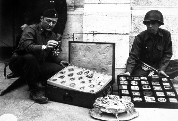 Нойшванштайн, Германия, май 1945 г.Хранитель памятников Джеймс Роример (слева) и сержант Антонио Вэлим рассматривают ценные произведения искусства, конфискованные Оперативным штабом рейхсляйтера Розенберга из коллекции Ротшильда во Франции и обнаруженные в замке Нойшванштайн. (Фото Национального управления архивов и документации, Колледж-Парк, штат Мэриленд.)