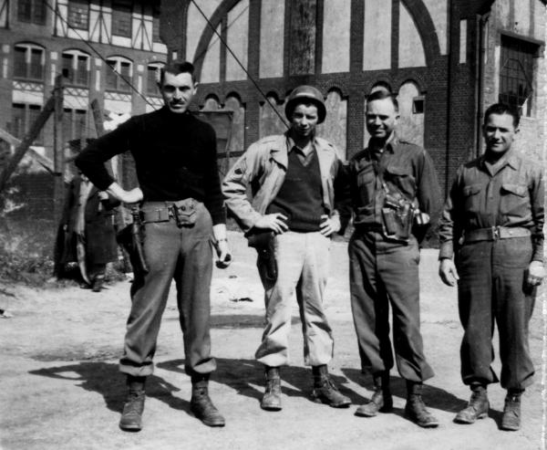Бернтероде, Германия, май 1945 г.Хранители памятников Джордж Стаут (слева), Уокер Хэнкок (в центре справа) и Стивен Коваляк (справа) на раскопках в Бернтероде. Между Стаутом и Хэнкоком – сержант Травезе. (Фото из личного архива Уокера Хэнкока.)