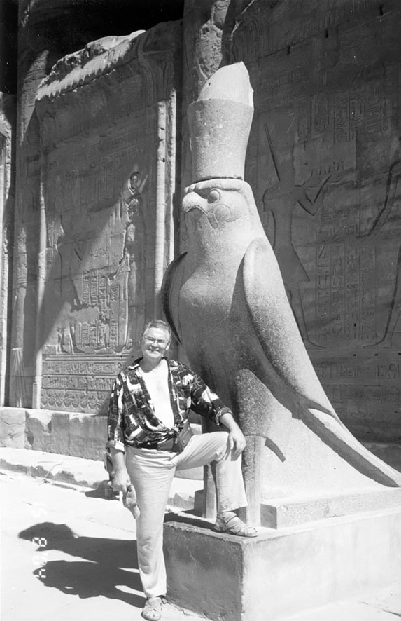 Далее, глядя на корону, я начал смутно припоминать, что где-то уже видел именно такую корону, и никакую другую. Порывшись в памяти, я вспомнил: в Египте! Посмотрите на рис. 97 в. На фотографии я стою рядом со скульптурой древнеегипетского бога Гора в виде сокола, которая находится в храме Эдфу на юге Египта, рядом с Асуанской плотиной. Его символом является солнечный диск с распростёртыми крыльями, то есть Гор имеет прямое отношение к разуму и мудрости, что неудивительно, потому что он является сыном Осириса.
