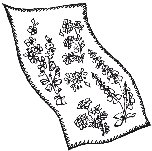 Края хлопчатобумажной ткани подвернуть 2 раза на изнаночную сторону и подшить, найти середину полотна. Портновским мелком по овалу нанести узор вокруг середины полотна. Натянуть ткань на пяльцы.