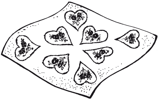 Силуэт сердечка вышить лентой кремового цвета стебельчатым швом, прокладывая каждый стежок по косой и начиная в середине предыдущего стежка. Остальные мотивы выполните точно так же (рис. 65).