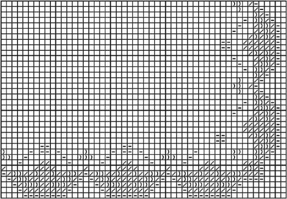 Края льняной ткани подогнуть на изнаночную сторону 2 раза и подшить на швейной машинке. По периметру покрывала нанести на полотно портновским мелком узоры на расстоянии 20 см от каждого края. Ткань натянуть на пяльцы. Вышивать по счетной схеме (рис. 68) нитью в три сложения на одну клетку ткани. Вышивку расположить по периметру, удалив на равное расстояние от краев, дополнительно оставив по 1 см. Готовую вышивку слегка отпарить с изнаночной стороны. Сверху по периметру дорожки притачать белое кружево.