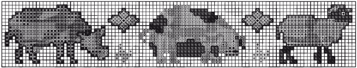 Вышивать крестиком по счетной схеме (рис. 70) нитью в 3 сложения на 1 клетку ткани. Готовую вышивку слегка отпарить с изнаночной стороны. По краям покрывала выполнить строчку «крестик» нитью голубого или розового цвета по периметру.
