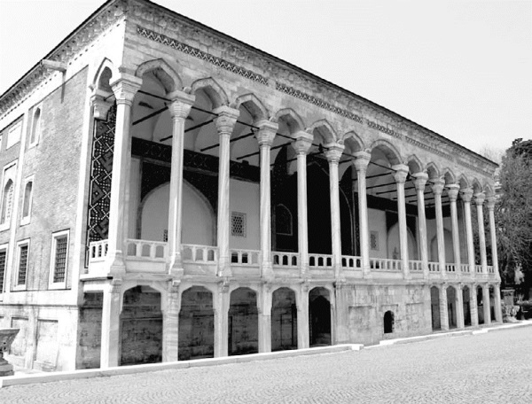 Дворец Топкапы состоит из четырех дворов с размещенными на них различными постройками. Все это окружено стенами. Эти дворы – от первого к четвертому – были все менее публичными, доступными.
