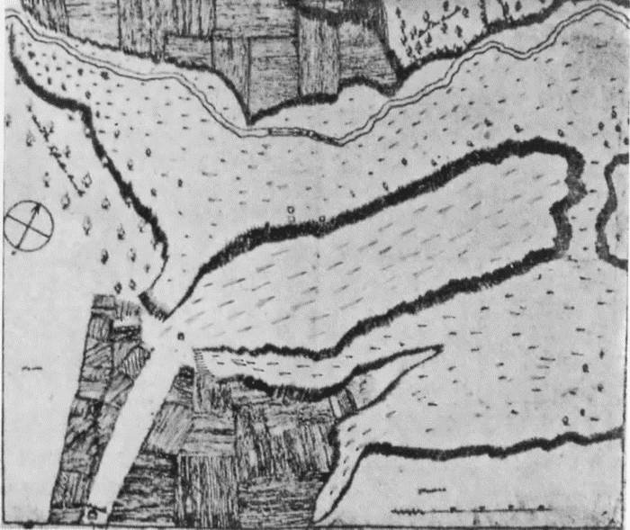 План местности на реке Вегмас (Карелия), где были обнаружены марциальные воды. Составлен Абрамом Петровым в 1724 г. На плане рукою Ганнибала помечено: «План, где найдены марциальныя воды по корельской дороге, снимал Абрам Петрович и принес в конторку 1724 году сентября в 4-й день».