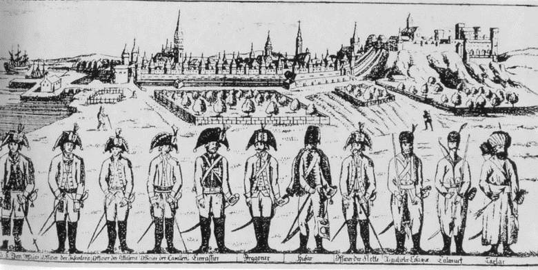Вид Ревеля в XVIII в. и войска российской армии той эпохи. На переднем плане слева направо: генерал-майор, офицер от инфантерии, артиллерийский офицер, кавалерийский офицер, кирасир, драгун, гусар, морской офицер, казак, калмык, татарин.