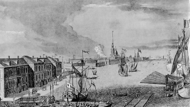 Вид вверх по Неве от Адмиралтейства и Академии наук. 1753 г. Гравюра Е. Г. Виноградова. Фрагмент. С рисунка М. И. Махаева, выполненного под наблюдением Д. Валериани. 1749 г.