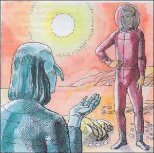 …«Ну что же он стоит и не отвечает?» — озадаченно думал Уиппи. В пятый раз он произносил приветственную речь, старательно проговаривая слова, и в знак дружбы крутил носом. Он написал своё имя на песке, название своей планеты и ключевые слова языка: Родина, мама, школа, и т. д. Нарисовал несколько законов аэродинамики и обозначил основные принципы движения космолётов. А существо напротив бестолково топчется на месте, выполняя какой-то танец с прутиком, изрезав при этом весь песок. Он понял, что добиться взаимопонимания будет нелегко. Что ж, его цивилизация умна и высокоразвита, и он обязательно что-нибудь придумает…