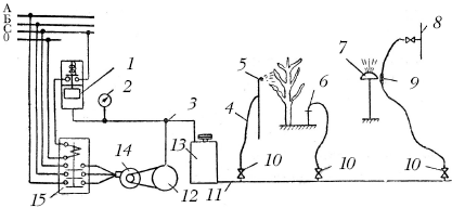 Универсальная садово-огородная установка.1 – реле давления, 2 – манометр, 3 – воздухопровод, 4 – шланг, 5 – насадка распылителя, 6 – гидробур, 7 – насадка поливалки, 8 – водопровод, 9 – тройник-смеситель, 10 – водопроводный вентиль, 11 – разводящая труба, 12 – компрессор, 13 – бак, 14 – электродвигатель, 15 – магнитный пускатель.