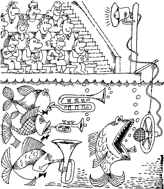 С помощью этих несложных устройств рыбы производят стуки, скрежет, удары, свисты, скрипы, всхлипывают, клохчут, мурлыкают, фыркают. Желтая макрель, встретив свою подругу, крякает от удовольствия. Бычок-кругляк во время нереста скрипит, подзывая самку, а увидев ее, начинает квакать. Черная рыба лает по-собачьи, а морские собачки предпочитают хрюкать. Морской петух (подумать только!), чтобы подать сигнал опасности, «кудахчет» курицей. Рыба-лоцман на ходу постукивает, чтобы ее властелин акула не отвлекалась и не задерживалась. Во время нереста бычок-кругляк верещит, а длиннорылый бычок-подкаменщик жужжит. Зеленушка-оцеллята, перед тем как подраться, цокает. Бычок-кругляк, охраняя гнездо, рычит. Рыба-дикобраз скрежещет, как ржавая дверная петля. Рябчик гризеус, выражая угрозу, барабанит, а сахалинский подкаменщик урчит. Испуганный спинорог свистит, чирикает, щелкает. Ракообразные чаще всего щелкают клешнями. А как киты производят звуки, неизвестно.