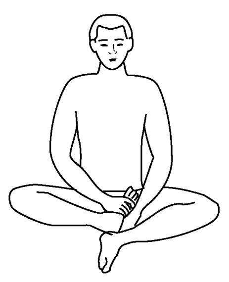 Для выполнения упражнения садятся на поверхность кровати, вытянув ноги. Правую ногу сгибают в колене и правую ладонь кладут на правую ступню около пальцев. Потом правую ступню кладут на левое бедро, чтобы правая пятка касалась низа живота. Левую ступню кладут под бедро правой ноги. Можно прибегнуть и к другому способу. Сначала подкладывают ступню левой ноги под бедро правой ноги, а потом ступню правой ноги на бедро левой.