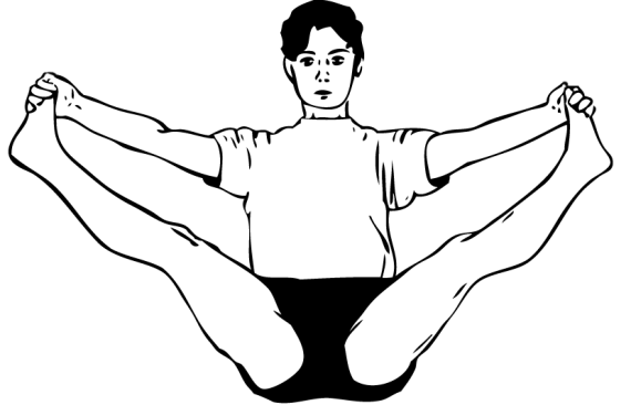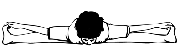 Сядьте прямо и разведите ноги в стороны как можно шире. Сделайте глубокий вдох; на выдохе вытяните руки и, наклонившись вперед к правой ноге, постарайтесь захватить двумя руками пальцы правой ступни. Наклоните голову и дотроньтесь лбом до правого колена. Задержите дыхание, оставаясь в этой позиции; вернитесь в исходное положение и сделайте вдох. Повторите это движение, сделав наклон влево, потом прямо. Разведите руки в стороны и на выдохе наклоните корпус вперед и дотроньтесь руками до пальцев ног. Лоб при этом касается постели. Если вы не сможете так низко наклониться, просто опустите голову как можно ниже. Если ваши руки не могут дотянуться до пальцев ног, можете пользоваться поясками (петля захлестывает ступню) или захватить руками лодыжки.