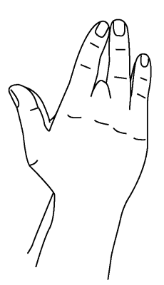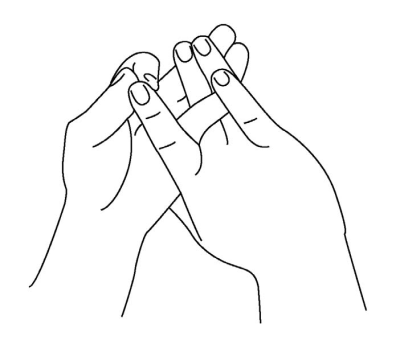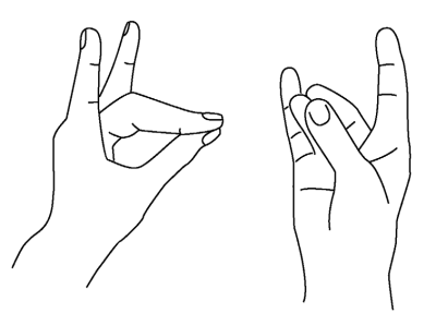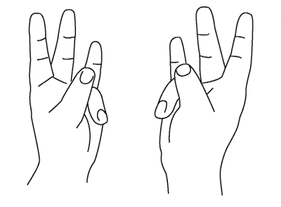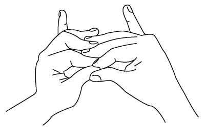 Методика исполнения: средний и сердечный пальцы правой руки кладутся на аналогичные пальцы левой руки. Мизинец левой руки кладется возле основания тыльной поверхности среднего и безымянного пальцев правой руки, затем все фиксируется мизинцем правой руки. Концевая фаланга указательного пальца правой руки зажимается между большим и указательным пальцами левой руки.
