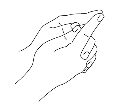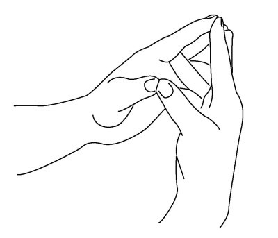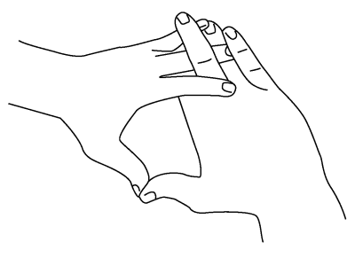 Методика исполнения: большие пальцы обеих рук соединены вместе. Указательный палец левой руки лежит на основании указательного пальца правой руки. Средний палец правой руки располагается на среднем пальце и мизинце левой руки. Сердечный палец левой руки под средним и сердечным пальцами правой руки. Мизинец правой руки помещен на концевой фаланге среднего пальца левой руки. Мизинец правой руки располагается на среднем и сердечном пальцах правой руки и фиксируется средним пальцем правой руки, который располагается на нем.
