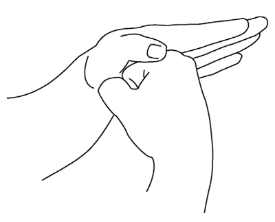 Методика исполнения: пальцы правой руки собраны и сжаты в кулак (рука). Кисть левой руки выпрямлена, большой палец прижат к кисти. Выпрямленная кисть левой руки прикрывает и прижата к тыльной поверхности кулака правой руки.