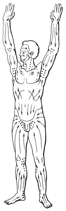 Прежде всего нам надо усвоить такую простую истину: сердце качает кровь, которая течет по направлению от центра к периферии, чтобы отдать кислород и питательные вещества всем органам и тканям организма. Затем кровь должна вернуться назад, к центру, чтобы снова обогатиться кислородом в легких и, пройдя через сердце, устремиться снова к периферии. Чтобы улучшить кровообращение, мы должны помочь крови вернуться обратно от периферии к центру. Поэтому все массажные движения всегда должны быть направлены от периферии к центру: то есть от кончиков пальцев к основанию, от кистей рук к плечам, от стоп к бедрам, и так далее. Направления массажных движений показаны на рисунке.