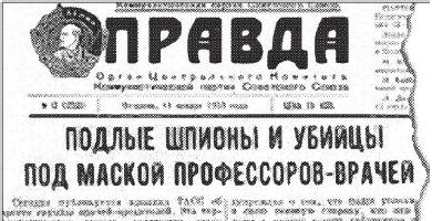 13 января 1953 года в газете «Правда» появилась очередная разоблачительная статья. Сообщение ТАСС касалось раскрытия органами государственной безопасности антисоветской деятельности группы врачей — «агентов иностранных разведок, злобных националистов, заклятых врагов советской власти». Тогда в списке вредителей числилось чуть больше десятка человек. Зато каких! Практически все они возглавляли крупные кафедры и клиники либо были консультантами Лечсанупра Кремля. Затем, после незначительного перерыва, среди медработников прокатилась новая волна арестов. А в прессе появилось сообщение о том, что группу «врагов светлого будущего» разоблачила Л. Тимашук, сотрудница отделения функциональной диагностики Кремлевской больницы. Долгое время бытовало мнение, что спусковой пружиной в «деле врачей» послужили многочисленные доносы этой женщины. Тимашук постоянно писала «телеги» на имя Сталина: врач-кардиолог по профессии, она утверждала, будто признанные светила медицины игнорировали ее предупреждение о серьезных нарушениях сердечной деятельности высокопоставленных больных, вследствие чего те покидали наш грешный мир.