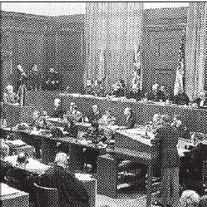 Члены трибунала: от СССР заместитель председателя Верховного суда Советского Союза генерал-майор юстиции И. Т. Никитченко; от США бывший генеральный прокурор страны Ф. Биддл; от Великобритании главный судья лорд Дж. Лоренс; от Франции профессор уголовного права А. Доннедъе де Вабр. Было проведено 216 судебных слушаний, председателем суда был представитель Великобритании Дж. Лоуренс. Перед судом предстали 23 обвиняемых. Среди них — рейхсмаршал Герман Геринг, партийный заместитель фюрера Рудольф Гесс, гитлеровский гросс-адмирал Редер, начальник отдела прессы министерства пропаганды Фриче, министр иностранных дел Иоахим Риббентроп, гроссадмирал Карл Дёниц и другие видные деятели нацистской партии. Нюрнбергский трибунал положил начало международному праву.