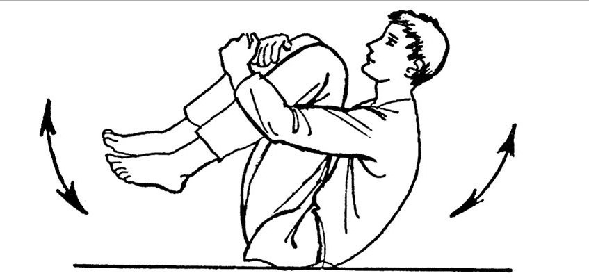 Расслабьте мышцы спины. Не отрывая головы от колен, сделайте мах ногами и прокатитесь на спине назад, а затем вернитесь в исходное положение. Делайте вдох при движении назад, выдыхайте – при движении вперед. Выполните 5–7 перекатов. Постепенно увеличивайте длительность выполнения упражнения до 1–2 мин.