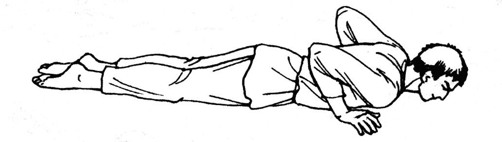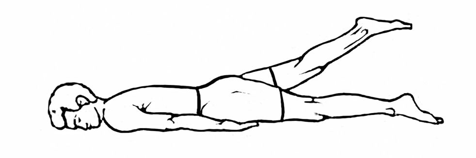 Выполнение: обопритесь на правую руку и плавно поднимите правую ногу. При этом правая сторона остается расслабленной, а основная тяжесть переносится на живот. Оставайтесь в этой позе несколько секунд и затем медленно вернитесь в исходное положение. Повторите то же другой ногой. Дыхание произвольное.