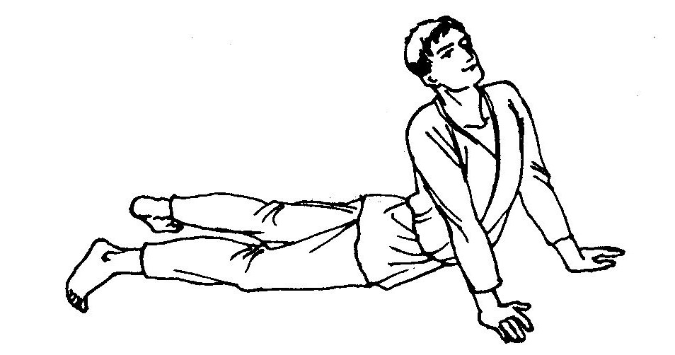 Удерживайте эту позу. Руки напряжены, локти чуть согнуты и касаются тела. Плечи опущены, лоб обращен вверх. Бедра, ягодицы, икры расслаблены. Область лобка находится на полу. Поза вначале освоения сохраняется 5–10 секунд – дыхание произвольное, затем это время продлевается до 1 минуты. Концентрируйте внимание на всем позвоночнике, почках и области крестца.