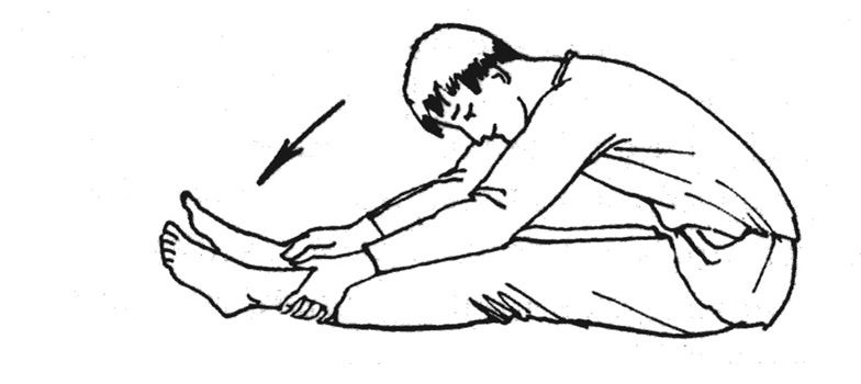 Оказавшись в положении сидя, выпрямите спину и продолжите наклон вперед с прямой спиной, подав подбородок вперед и вверх. Возьмитесь руками за ступни, постарайтесь коснуться подбородком коленей. Расслабьте мышцы спины и выдвигайте подбородок вперед. Тело должно походить на складной нож. Старайтесь, чтобы грудь покоилась на ногах, локти касались пола. Ноги все время остаются прямыми. Если не удается настолько согнуться, захватите руками ноги в области лодыжек. Если не удается подъем, начинайте вход в асану из положения сидя.